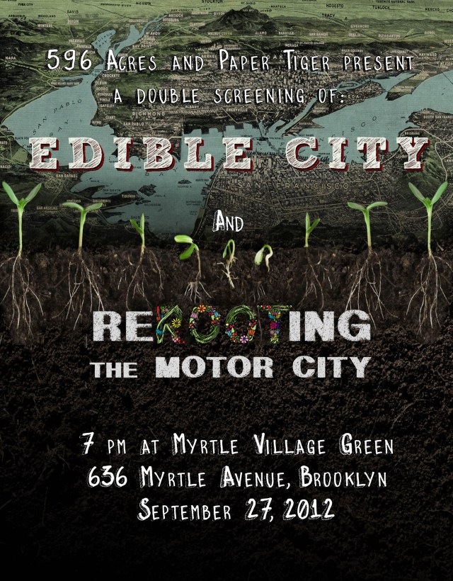 This week has me digging deeper into the world of public film screening, poster design and (of course) urban agriculture. Paper Tiger is screening its latest full-length film Rerooting the Motor City at a brand new community garden that opened Saturday in Brooklyn.